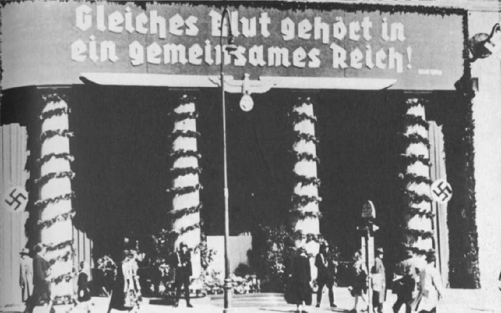 1938年,维也纳街头的大幅标语:“同样的血液属于一个共同的国家!”