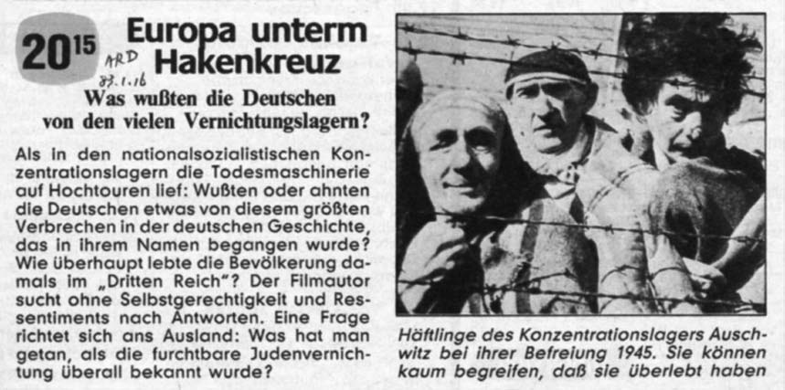 从1982年10月17日到1983年1月30日,德国电视一台在每星期天晚上20点15分的黄金时段播出13集文献纪录片《纳粹卐字下的欧洲》。这部纪录片根据罗曼·布洛德曼(Roman Brodmann,1920—1990)的同名书籍摄制。