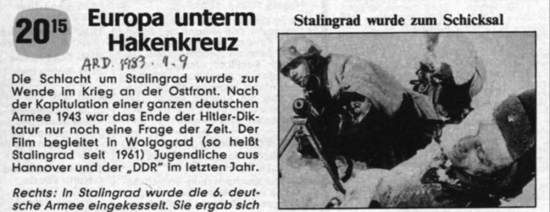 在斯大林格勒战役结束整整40周年的1983年2月1日和2月2日,德国电视二台和电视一台,分别播出了“斯大林格勒——40年后”(Stalingrad-40 Jahre danach)和“斯大林格勒——一个悲剧的纪年”(Stalingrad-Chronik einer Tragödie),各有说明:“第6集团军士兵回忆那悲惨的包围战”和“40年前保卢斯将军指挥的第6集团军投降了。”
