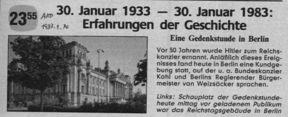 德国电视一台播出专题节目《1933年1月30日——1983年1月30日:历史的经验,柏林,一个令人思考的时刻》