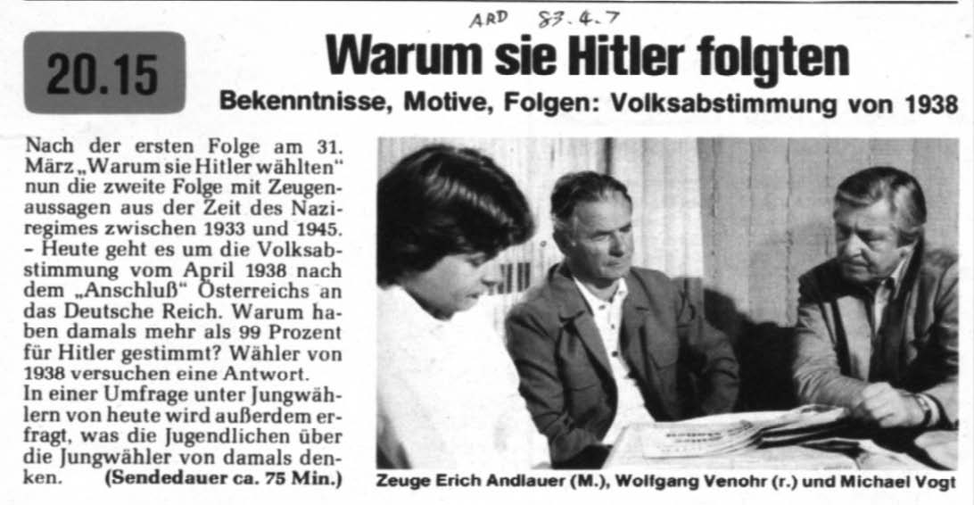 德国电视一台1983年3月31日播出节目《为什么你们选择了希特勒》(Warum sie Hitler wählten),4月7日又播出《为什么你们追随了希特勒》(Warum sie Hitler folgten)。当一个国家处在经济困难、社会不安定的环境中,往往容易出现“极端主义”思潮,并有追随者出现,这都不足为怪。但是,如果支持的人成为大多数,那就值得深思了。1983年的德国人,正是这样来反思自己半个世纪前所做的事情。