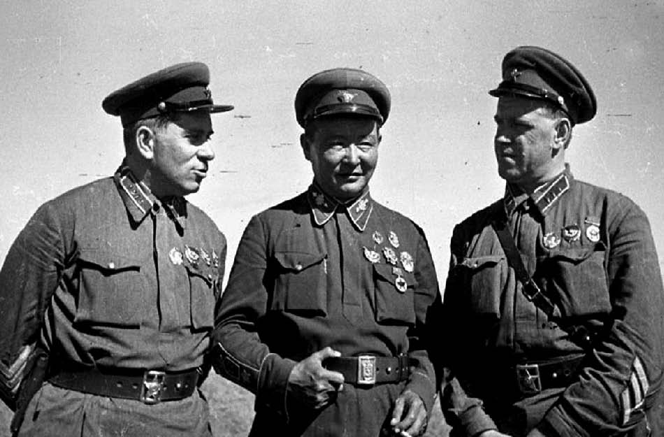 1939年7月诺门罕战役期间的施特恩(左)、蒙古人民共和国元帅乔巴山和朱可夫(右)