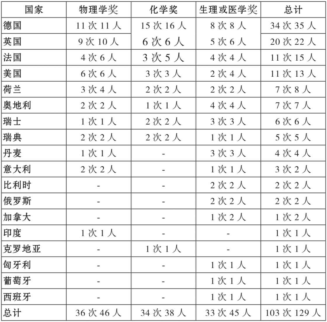 (有些年份一个奖项由不同国家的科学家分享,所以各国得奖次数与得奖人数并不相同。)
