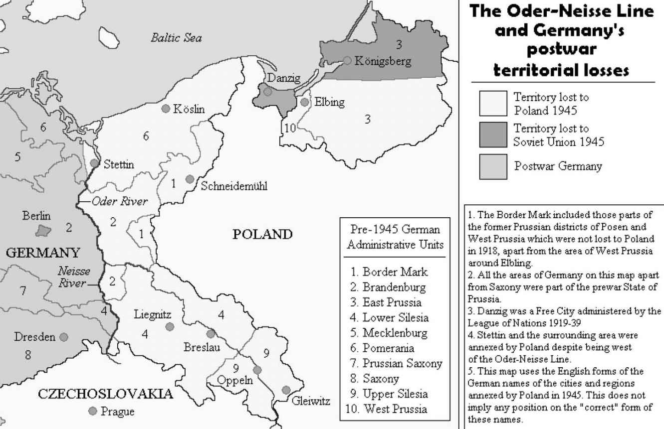 希特勒发动战争、尤其是发动对苏战争的一个重要动机是为德意志民族夺取“生存空间”,结果却适得其反。按照丘吉尔“三根火柴”都要挪动的主张,德国失去了大片领土。我在哥廷根的时候,不少德国人告诉我他们来自“东部”,我以为那指的是“东德”,大概是因为不赞成那里的社会主义制度来到西德的,后来才明白“东部”所指还在“东德”以东,即奥德-尼斯河边界以东,“二战”后划给波兰的那片土地,还有南北两半分别划给波兰(占多一半)和苏联(占少一半)的东普鲁士。