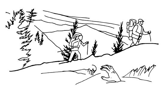 在高低不平的地带前行将会限制你的视野。如果可能的话,请尽量避免高地。呆在谷地里。时刻警惕周边的山坡,以防有僵尸发现你。高地在定位、确认路线、认准僵尸位置时很有用。当你接近高地时,你得高度注意了。降低身段,监视那些可能出现的影子,注意辨听僵尸的嚎叫声。