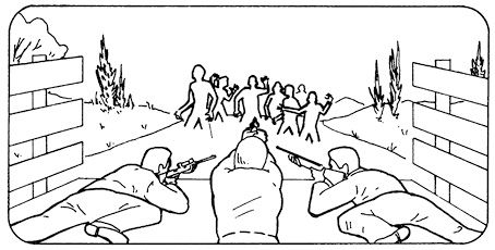 这一战术其实跟“引诱与歼灭”类似,唯一区别在于,你得将它们引出数英里,直至它们进入一处固定地点。这一地点你可以用残骸、带刺铁丝网、废弃车辆或是你自己的车辆围成。一旦建成了,你和你的团队就可以守住它,坐等僵尸来临,等它们越过路障时干掉它们。此时,纵火装置就很理想了。你最好等那些逼近你们的僵尸团团聚在一起时,一举使用莫洛托夫鸡尾酒或(仅在这种情况下可行)火焰喷射器引燃它们,这就可以彻底摧毁它们的队伍了。显然,你还可以用带刺铁丝网或是其他类似障碍物来减缓它们的行进,或是将它们聚集在一起。即使纵火并不可行,单纯的射击也可以达到同样的效果。保持与僵尸之间一定的安全距离,当然也要尽量节约弹药,时刻警惕你的侧面。如果可能的话,确保区域接近通道狭窄而难以通过。确保团队有安全的撤离路径,但要尽量避免过早撤退。在城市或是那种能提供极佳视野地区运用这种战术,在丛林、沼泽或森林则尽可能不要使用。