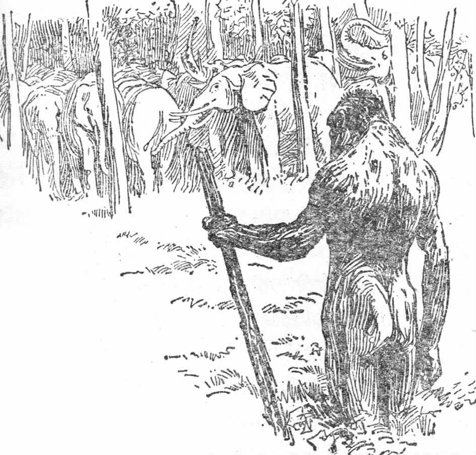 一个巨大的远古人看守着这群乳齿象