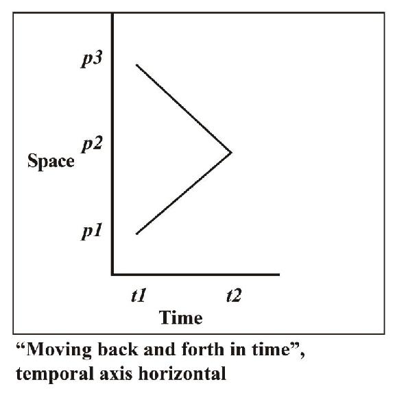 现在我们的问题是:这第二个命题是否正确?从这个角度来说,一个物体是否能够“在时间中前后移动”?答案其实是正确,原因平淡无奇。为了令其更为直观,我们通过翻转,将时间轴变为水平,从而使“在时间中前后移动”的图示与我们早前的那一个类似(见标题为‘在时间中前后移动,时间轴水平’的图示)。很明显,图中表示一个物体起初在t1位于两个位置,p1和p3,然后在t2则只处于一个位置,即p2。这听上去比实际情况要怪异。设想有一双拍掌的手。最初两只手是分开的——一只在p1位置,另一只在p3位置。随后两手彼此接近并触碰。这双手现在就在p2位置。最后,假设这双手在时间t2消失。这样的场景就是图示所要表现的。