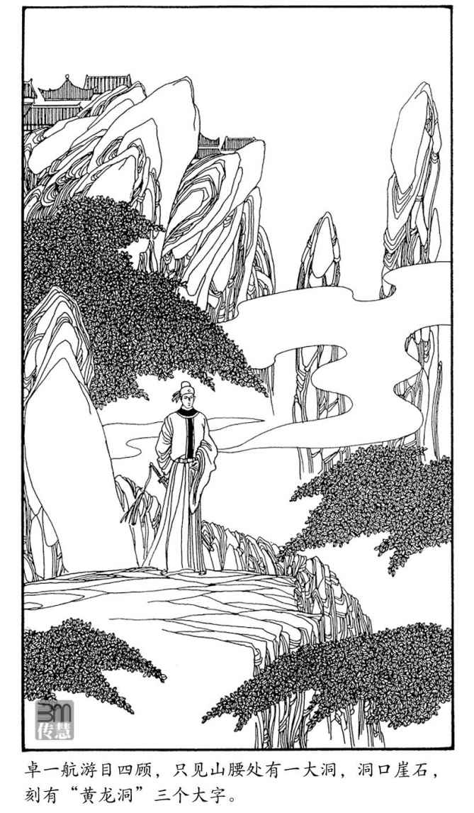 卓一航游目四顾,忽见半山腰处,有个大洞,洞口崖石,刻有“黄龙洞”三个大字,洞外修竹成丛,古松几树,还有石几石凳,想是观中道士见这古洞风景颇佳,特意经管的。卓一航道声“侥幸”,这山洞正好避雨,于是迈步入内,入了洞后,外面雷声接连不断,大雨已是倾盆而下。