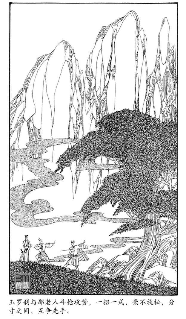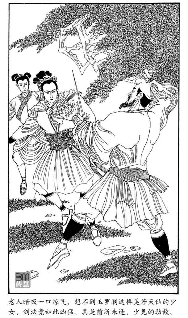 老人这一掌运足内家功力,一掌劈去,呼呼风响,玉罗刹一掠避过,衣袂风飘,长剑突自半空刺下,老人霍地一个转身,双掌齐出,猝击玉罗刹命门要穴,玉罗刹身形微动,长剑一招“金针度线”反挑上来,那老人似早已料到她要使这一招,抢前一步。玉罗刹剑尖在他肋旁倏然穿过,他双掌合拢,左右一分,霎忽之间,已从“童子拜观音”的招式变成“阴阳双撞掌”,向玉罗刹痛下杀手。哪知玉罗刹也似早已料他有此一招,剑把一沉,剑锋反弹,转向老人腋下的“期门穴”刺去,老人脚步不动,身形陡然一缩,避开这招,突然化掌为拳,一招“横身打虎”猛捣出去。玉罗刹拔身一纵,又飞起一丈多高,斜斜向下一落,老人喝道:“小辈接招!”跟踪猛扑,玉罗刹盈盈笑道:“老贼接招!”剑身一横,平削出去,老人只道她使的是达摩剑中的“横江飞渡”,脚踏“坎”位,转进“离”方,反手一掌,就要擒她持剑的手腕,哪知玉罗刹一剑削去,方到中途,剑势忽变,正正向着对方所避的方位削来,那老人大吃一惊,幸他武功精湛,变招迅速,从“离”位一旋,左掌骈了中食二指,反点玉罗刹肩后的“凤眼穴”,玉罗刹剑势疾转,以攻对攻,迫得老人又从“离”位避开,两人的攻势都落了空。