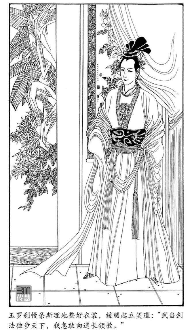 红云咄咄逼人,玉罗刹竟是若无其事,口说遵命,却并不拔剑。红云道人气极,把剑在鞘中一插,左掌突发,袍袖带风,骈伸二指,一个“画龙点睛”,径向玉罗刹面门点去,哪知玉罗刹身形微晃,红云道人扑了个空,忽觉背后金刃挟风之声,一团冷气倏忽迫来,红云道人大吃一惊,幸他武功极高,脚尖点地,一个“弯腰插柳”,运用旋身之力,飞窜出去,在旋身之际,还卖弄了一手武当派“鸳鸯连环腿”的绝顶功夫,听风辨器,左脚向后一蹬,向玉罗刹持剑的手腕疾踢,玉罗刹一个滑步移身,红云已纵出丈许之地又转过身来。玉罗刹长剑在手,盈盈笑道:“道长怎么不拔剑呀?”