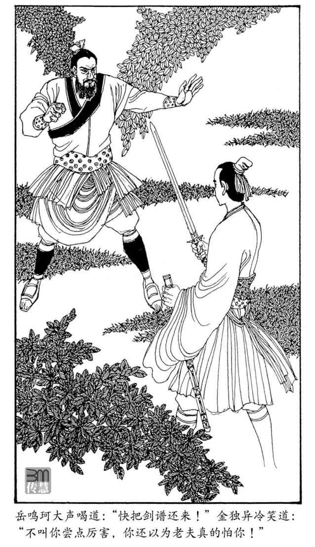 岳鸣珂左掌一推,将金千岩推倒地上,挡剑待敌,只见金独异跑了出来,狞笑说道:“哼,你真是地狱无门偏进来!来,来,来!剑谱就在这里,有本事的来拿!”