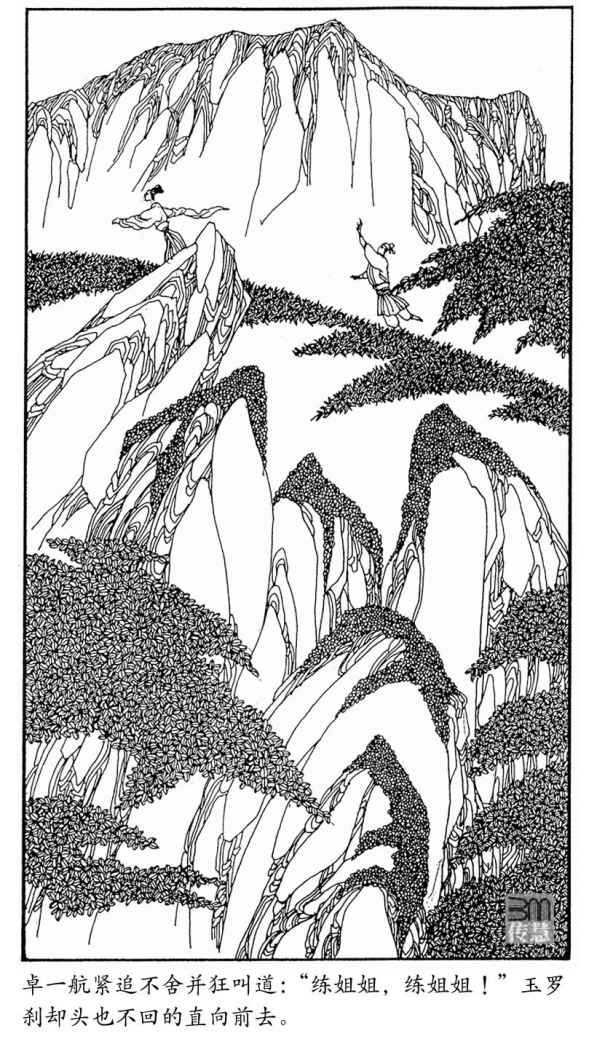 卓一航不敢下看,回过头来,只见白发魔女那张面冷森森的木无表情。卓一航不知她戴的面具,不觉一阵寒意直透心头,鼓起勇气叫道:“练姐姐,练姐姐!”白发魔女盯他一眼,忽然扭头便走。卓一航紧追不舍,狂叫道:“练姐姐,练姐姐!”按说白发魔女的轻功比他高出不知凡几,若然真跑,卓一航望风不及。她却故意放慢脚步,总保持着二三十步的距离。到了一处峰头,忽然站着,回头凝望。正是: