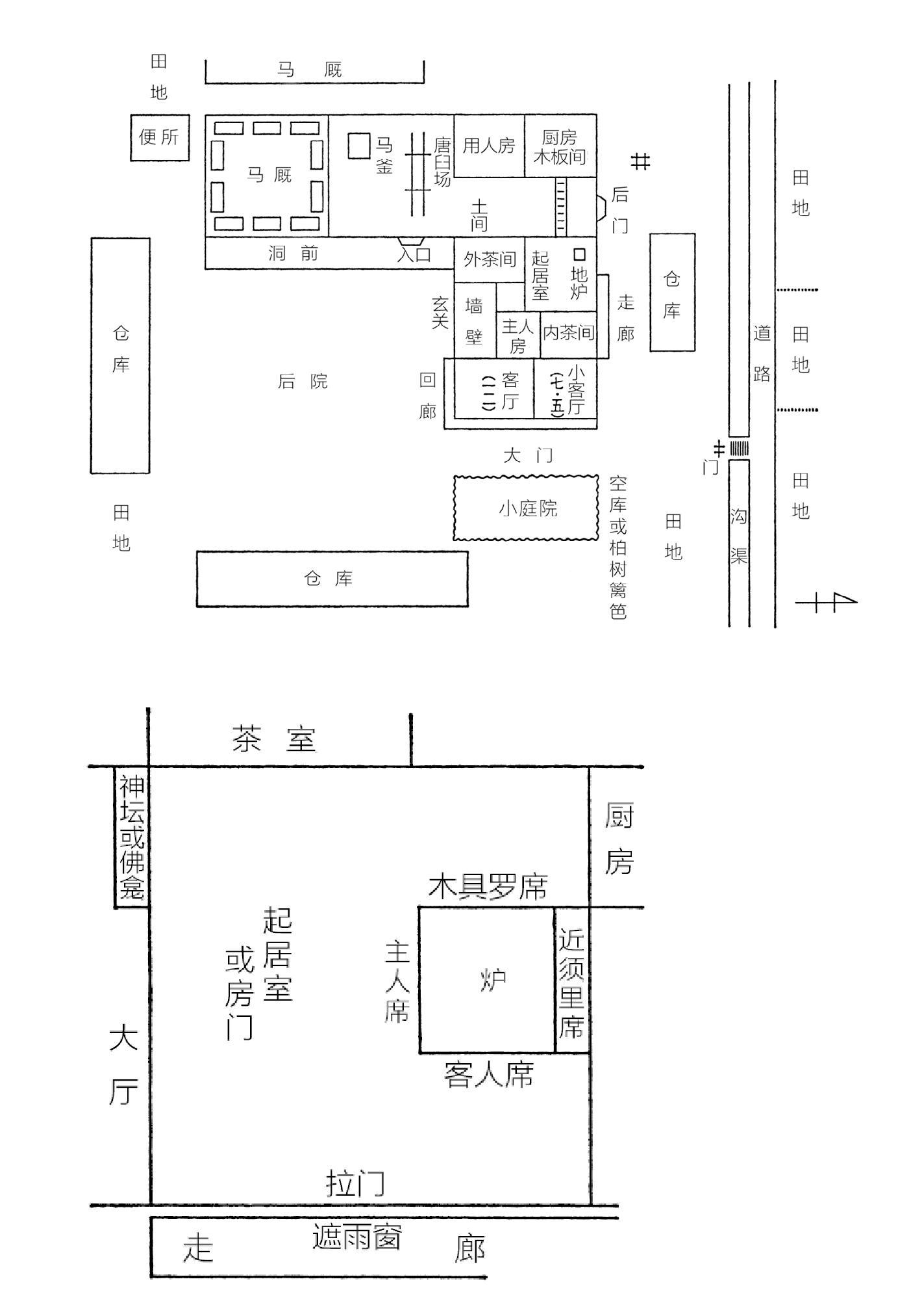 当地人称大门为“城前”,屋子周围是田地,大部分都不会设围墙、篱笆等地界。主卧室和叫作“内室”的起居间之间有个小房间,这房间非常狭窄,而且没有窗户,一片阴暗,叫作“座头房”
