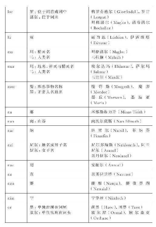 这个精简过程主要涉及这样的事实—精灵语名称的英语译名也经常作为名称独立使用。例如,辛葛王居住的地方既称为“明霓国斯”,又称为“千石窟宫殿”,有时二者还同时出现。我对这类情况的基本处理方法是,将精灵语名称和它译成的含义列进同一条目,如此一来,条目下的页数参考不限于当前条目本身(例如,“埃霍瑞亚斯”下的页数参考也包括那些列在“环抱山脉”下的)。英语译名只有在独立出现时才给出单独的条目,但只简单地指向主条目。说明中用引号括起来的部分是该名称的翻译,其中很多都在故事正文中出现过(例如:“孤岛”埃瑞西亚),但我又另外补充了很多。还有一些未曾翻译的名称,相关信息收录在《附录》当中。