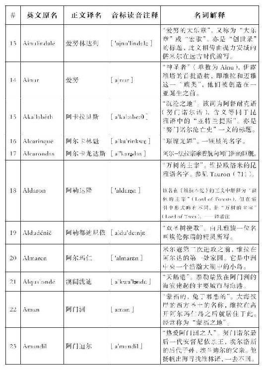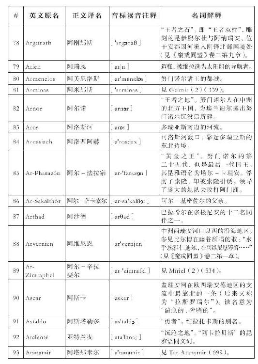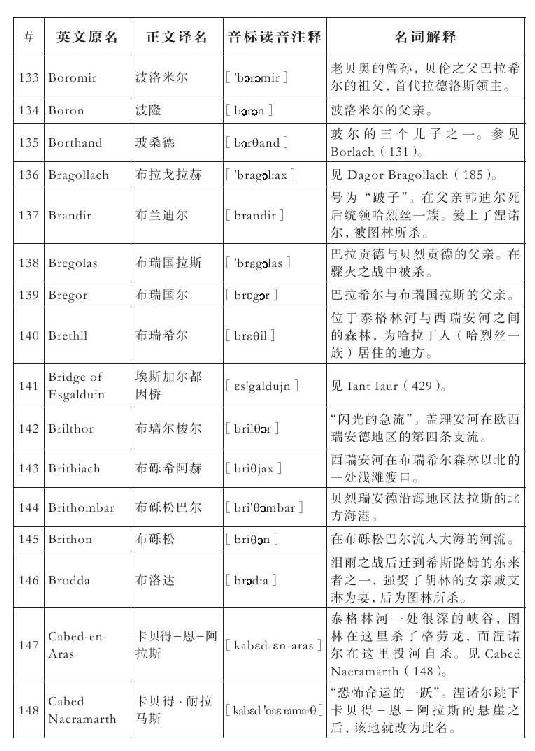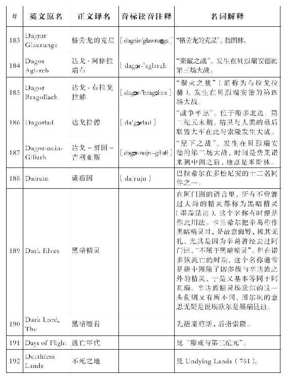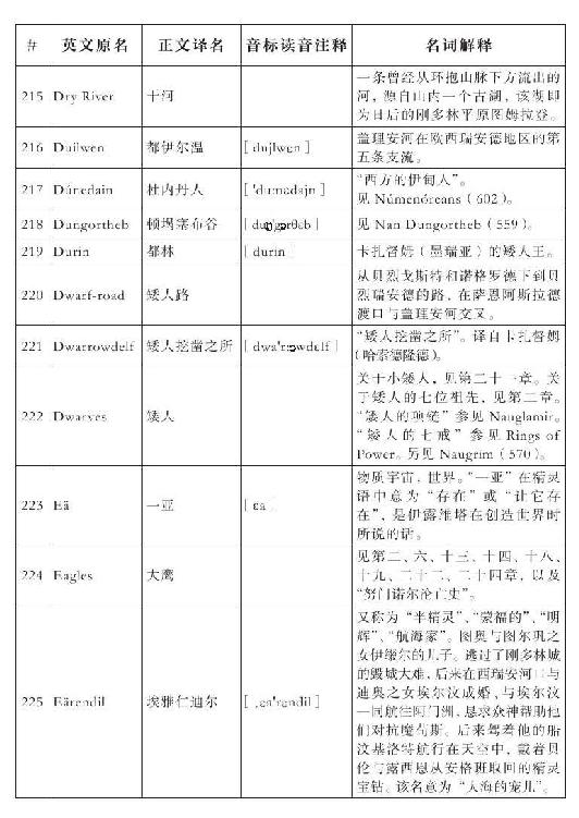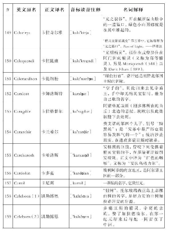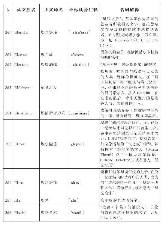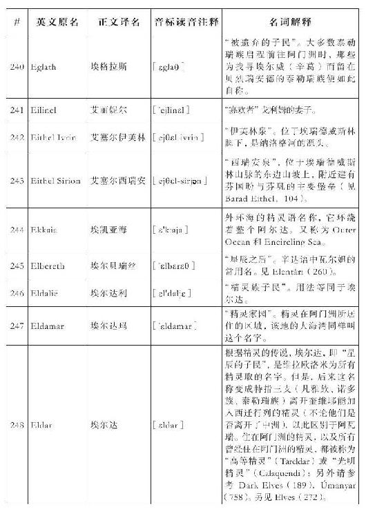 lembas:译为“兰巴斯”(而非“伦巴斯”),既为美观,又考虑其词源lenn-mbass,更是约定俗成的译法。