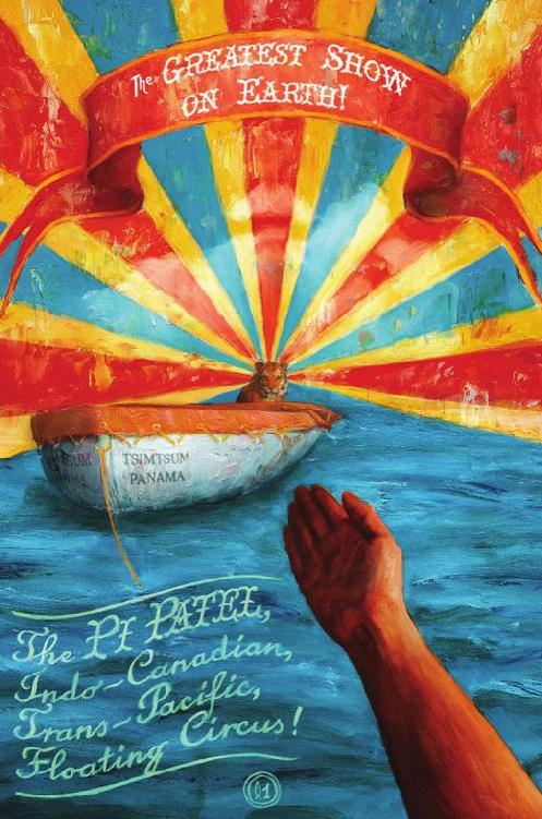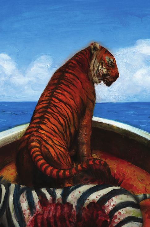 我的漂流伙伴进入了视线。他趴在舷边,朝我这边看。无论在任何环境里,一只突然出现的老虎都十分醒目,在这里更加如此。他那身有条纹的鲜艳斑斓的橘黄色毛皮和毫无生气的白色船壳之间的对比十分奇特,形成了引人注目的强烈效果。我过度紧张的感觉戛然刹住了。虽然我们周围的太平洋很广阔,但是在我们之间似乎突然出现了一道非常窄的深沟,沟边没有沙洲也没有城墙。