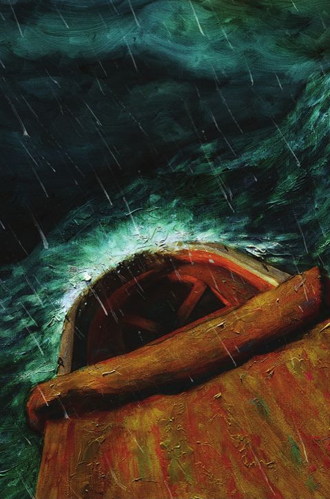 一天下午,慢慢地起了一场风暴。云仿佛受了惊吓,在风前面跌跌撞撞地跑。海也学云的样,升起又落下,让我的心都沉了下去。我把太阳能蒸馏器和鱼网都收了进来。噢,你们真应该看看那幅景象!到目前为止,我见到的只是小山丘般的海水,而这些长浪是真正的大山。我们所处的山谷太深了,里面一片昏暗。山坡太陡了,救生艇开始朝坡下滑去,几乎像在冲浪。小筏子被异常粗暴地对待,被从水里拉出来,拖在船后面,乱颠乱跳。我将两只海锚都抛了出去,让它们一前一后拖在水中,这样两只锚就不会绞在一起了。