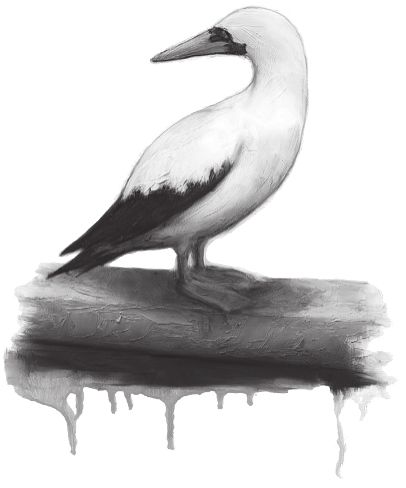 我捉假面㭴鸟的运气要好一些。它不知从什么地方冒了出来,滑翔着朝我们飞来,展开的翅膀有三英尺多宽。它落在舷边我伸手可及的地方。它圆圆的眼睛敏锐地看着我,眼神既迷惑又严肃。这是一只大鸟,一身雪白的羽毛,只有翅尖和翅膀后缘的羽毛是乌黑的。大大的球茎状的脑袋上长着一只很尖的橘黄色的嘴,如同一张黑色假面具的脸和面具后面的红色眼睛让它看上去像个偷了一夜东西的小贼。只有那双长着棕色的蹼的过大的脚还不够完美。这只鸟毫不畏惧。它花了好几分钟时间用嘴啄羽毛,露出了下面柔软的绒毛。啄完后,它抬起头来,整个身体清楚地展现在我面前,露出了它的实际模样:一架线条流畅、外观漂亮的流线型飞艇。我喂它一小块鲯鳅肉,它就在我手上啄食,嘴戳着我的手掌心。