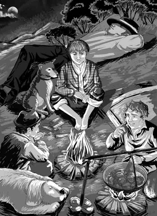 孩子们坐在火堆周围,本来想把我吃掉的两条狗也坐在这儿。它们有好一阵子不能容忍我在场,无精打采地眯着眼睛,斜睨着火堆,有时带着非同一般的自尊感呜噜几声。先是呜噜,后来就轻声尖叫,似乎很惋惜自己的意图不能实现。孩子共有五个:菲佳、巴夫路沙、伊柳沙、科斯佳和瓦尼亚。我是从他们的谈话中知道他们的名字的,现在我就把他们介绍给读者。