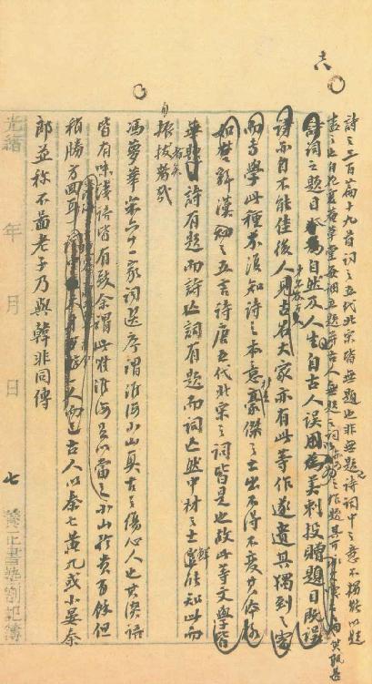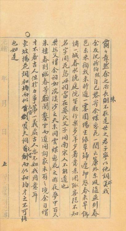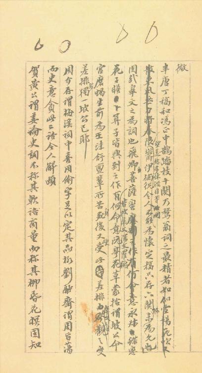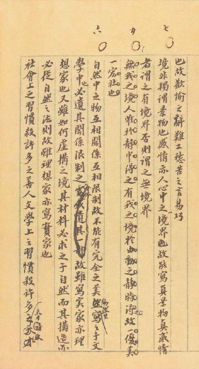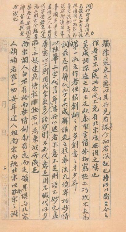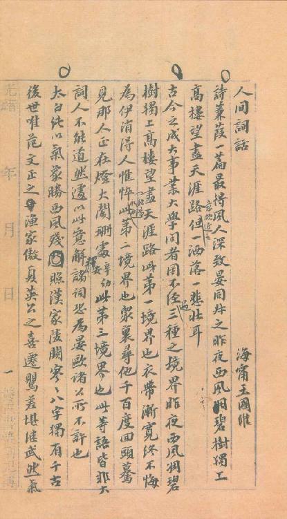 手稿本为王国维最初写作《人间词话》之稿本,凡一百二十五则。手稿本前三十则主要是对传统诗词理论的辨析与引申,第三十一则提出境界说之后,才有对境界的诠释和分类等条目。自第三十一则后,近现代西方的哲学美学话语以一种参证的方式融入进来。
