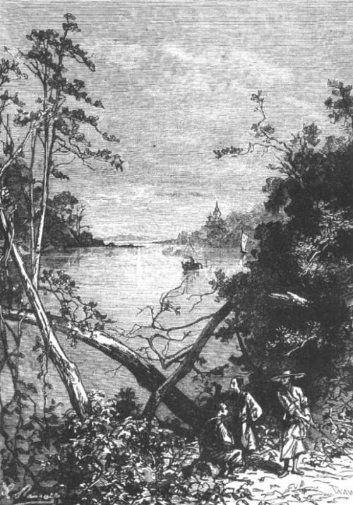 河两岸的风景不断地变换,河流的右边明显比左边高得多,左岸低是因为浪涛拍岸冲打的原因。河岸以外是一望无际的高粱、玉米、小麦和粟谷,中国有几亿人口要吃要穿,不能留下一块荒地。大地上,水渠纵横交错,到处架着竹筒抽水机,把渠中的水抽上来,送到四面八方。黄泥小屋周围是一片片苹果园,看上去并不比诺曼底大平原逊色。沿岸还可以看到许多老渔翁赶着鸬鹚打渔。鸬鹚看见鱼就钻进水里,再冒出水面时,嘴里便叼着一条鱼。鸬鹚的脖子上带有一个环,以防它们把鱼吞下去。水鸭、乌鸦、喜鹊和麻雀,听到汽船的汽笛声后惊恐万状,在岸边那稀少的草丛里四处飞蹿。