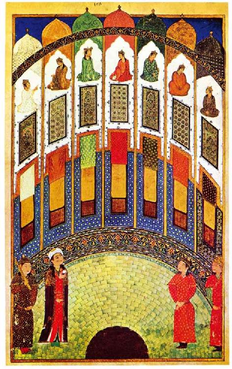 [10]在内扎米的《七美图》中,巴赫拉姆·古尔整日打猎,寻欢作乐,在前来进犯的中国军队百前节节败退。中国皇帝被胜利冲昏头脑,麻痹大意,反被巴赫拉姆·古尔偷袭得手。大获全胜之后,巴赫拉姆·古尔一时兴起,建造了七座宫殿,将伊朗、中国、花拉子模、印度、罗马、马格里布(北非地区)、苏格里布(巴尔干半岛一带)七个国家的七位公主藏娇其中。七座宫殿七种颜色,巴赫拉姆·古尔每晚临幸一座宫殿,听公主讲故事。巴赫拉姆·古尔每周二临幸红色宫殿,听身穿红衣的苏格里布公主讲红色给人带来幸福快乐的故事。因此,内扎米的《七美图》又被称为《七座宫殿》。