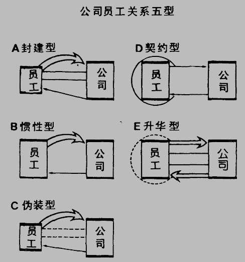 A为封建型,即员工承认公司为君亲师,以过大劳务(↑↑)换取嫌少(↑)报酬而甘之如饴,公司亦吃定员工,百般索求(右方块大于左方块,表示右压迫左)。