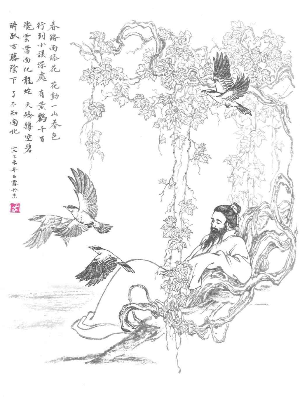 少游名观,高邮秦氏子,号太虚,又号淮海居士,词集名《淮海居士长短句》。《宋史·文苑传》说他“少豪隽,慷慨溢于文词。举进士,不中。强志盛气,好大而见奇,读兵家书,与己意合”,可见他少年时原是豪侠之气十足的慷慨之士,他爱读兵书,大概是想学习他的祖上,统将领兵,驰骋沙场。少游后来仍以文士出身,是受东坡的影响。他第一次见东坡,是在徐州,东坡读了这位小自己十三岁的才人所作《黄楼赋》,大加青赏,说他有屈原、宋玉之才,并把他介绍给王安石,王安石也非常欣赏少游诗,认为他诗风清新俊逸,仿佛南朝的鲍照、谢朓 。东坡劝他应举读书,挣取功名,以奉养父母,少游这才应试登第,做了定海主簿、蔡州教授。