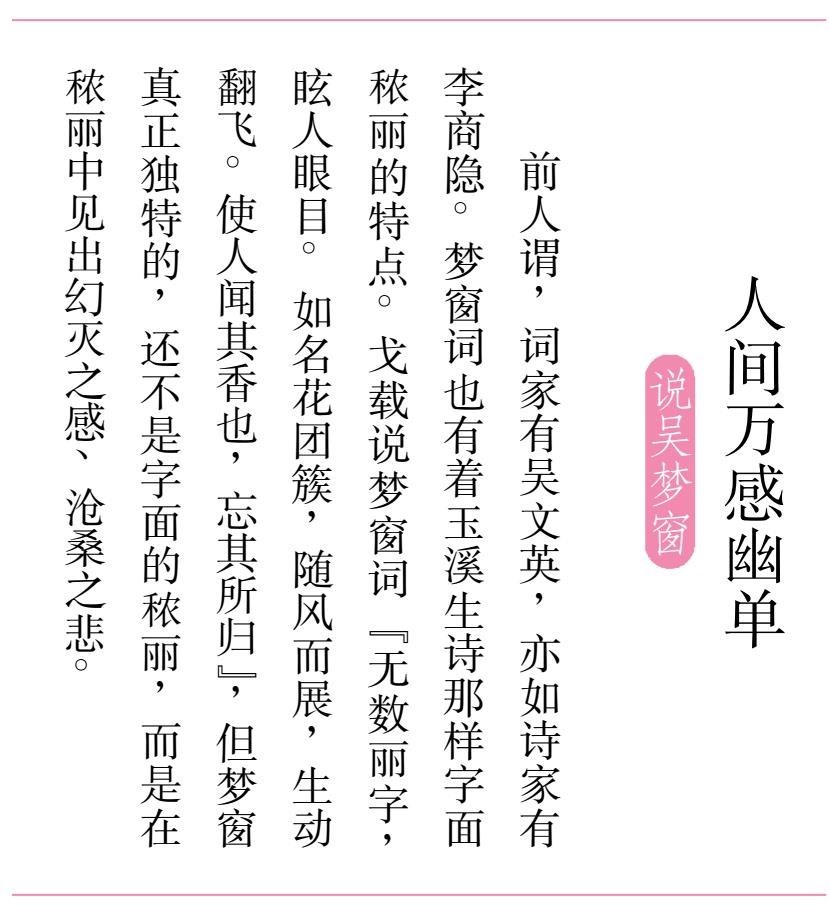 晓川师的见解让我若受电然,我这才发现,原来梦窗有如此沉厚的气息,如此悲悯的胸襟。后来再读清末大词人陈洵的《海绡说词》、现代大学者刘永济先生的《微睇室说词》,渐渐读懂了梦窗的词,也就更能理解,何以这位毕生未中进士,沉沦于幕僚曹官这一类低等职位的失意文人,会被宋末的尹焕推崇为南宋第一,会被周济许为“ 奇思壮采,腾天潜渊”,与周邦彦、辛弃疾、王沂孙并著为“ 宋四家”,会得到王鹏运、朱祖谋、郑文焯、况周颐、冯煦、张尔田等晚清学者的一致推崇。