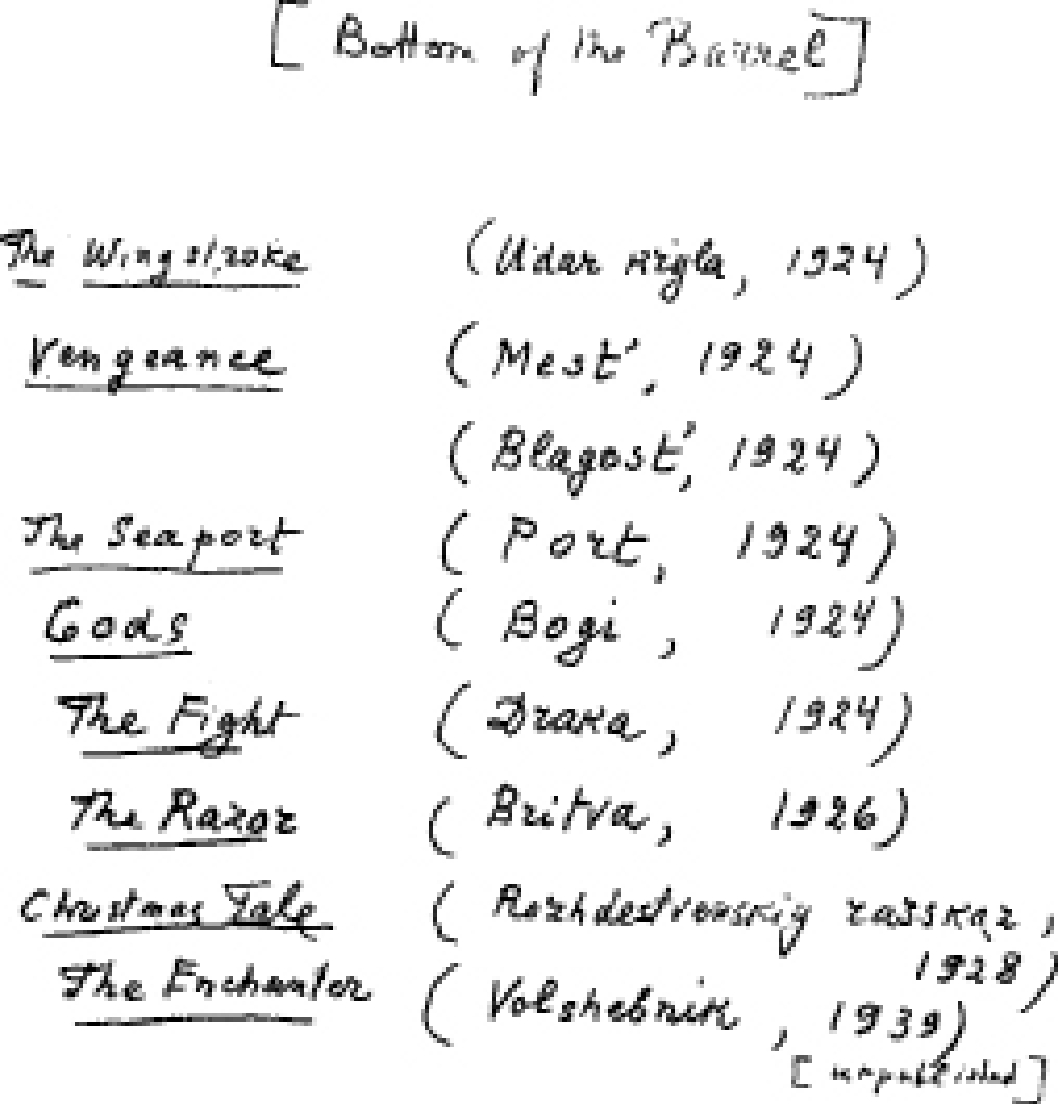 纳博科夫手拟的短篇小说篇目单,标注为“木桶的底”。