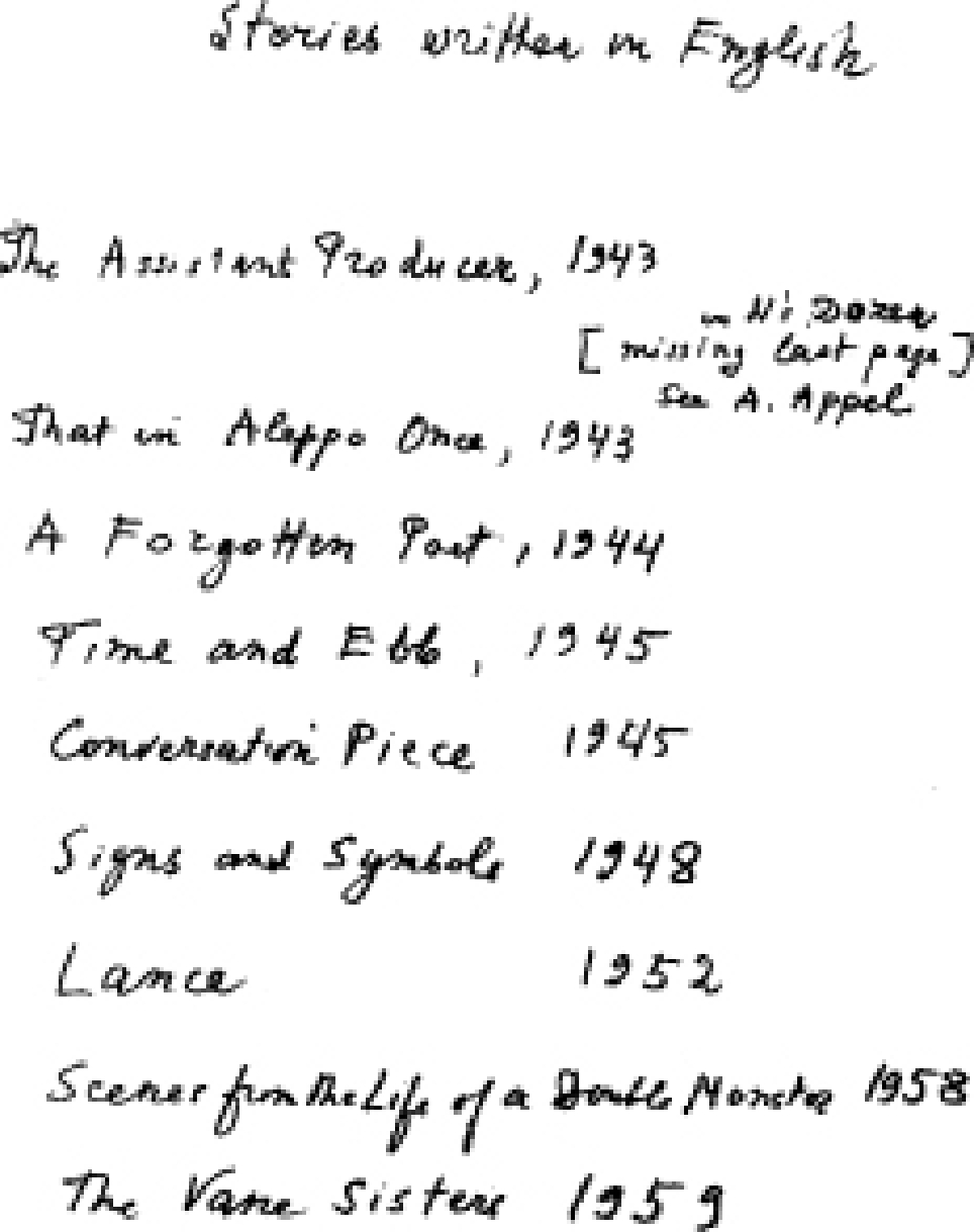 纳博科夫手拟的短篇小说篇目单,标注为“用英语写的故事”。