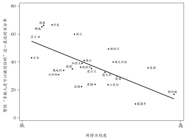 图表4.1:在较平等的国家,赞同“多数人是可以被信任的”这一表述的人比例更高。