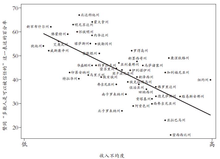 图表4.2:在较平等的美国各州,赞同“多数人是可以被信任的”这一表述的人更多(只能获得41 个州的数据)。