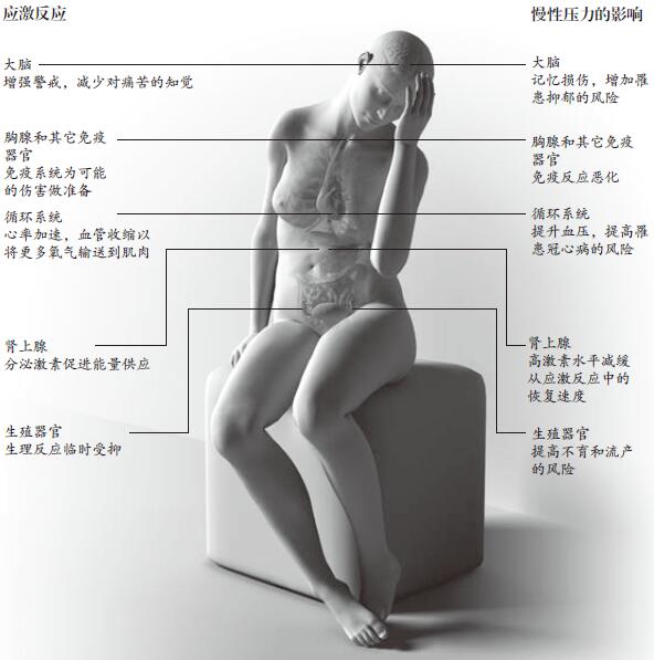 长期调动能量,将其以葡萄糖的形式注入血液,会导致不该变胖的地方变胖(即中央型肥胖),乃至患上糖尿病。长期的血管收缩和凝血因子水平上升会导致高血压和心脏病。短暂的压力会调动我们的免疫系统,但长期的压力会抑制免疫系统,导致儿童发育不良、女性排卵受阻、男性勃起功能障碍、所有人消化系统均出现问题。大脑中某些区域的神经元将受损,认知能力将下降。我们还将难以入睡,长期的压力将令我们筋疲力尽。