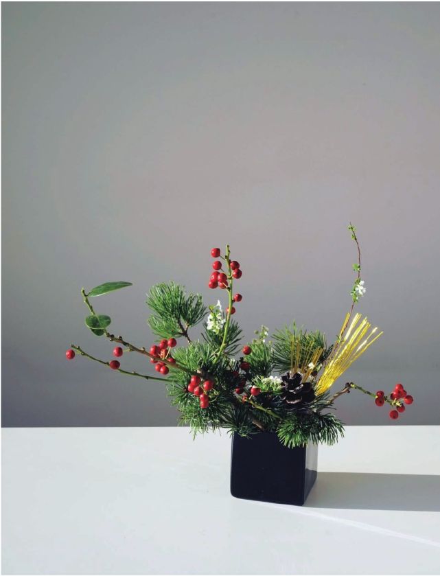 步骤七 剪几枝雪柳的侧枝,不规律地插置在五针松的空间里,右侧可以高高挑出一枝,以拉动与左边倾斜的平衡感,再将已经制作好的金色装饰物,向右侧一高一低斜插入花泥中,一款充满节日气氛的小桌花就完成了。