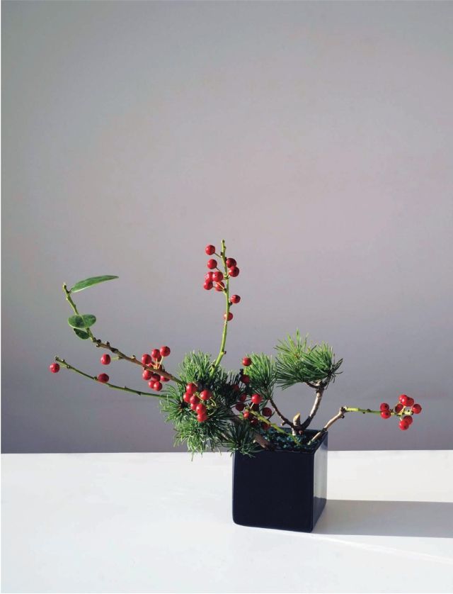 准备花材 冬青果、雪柳、五针松