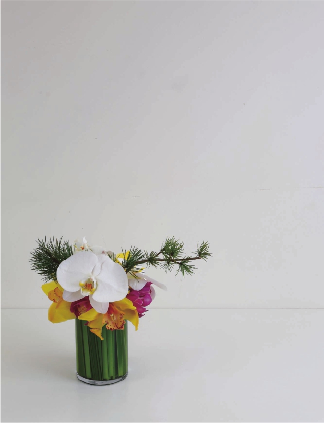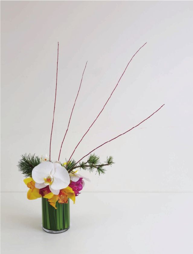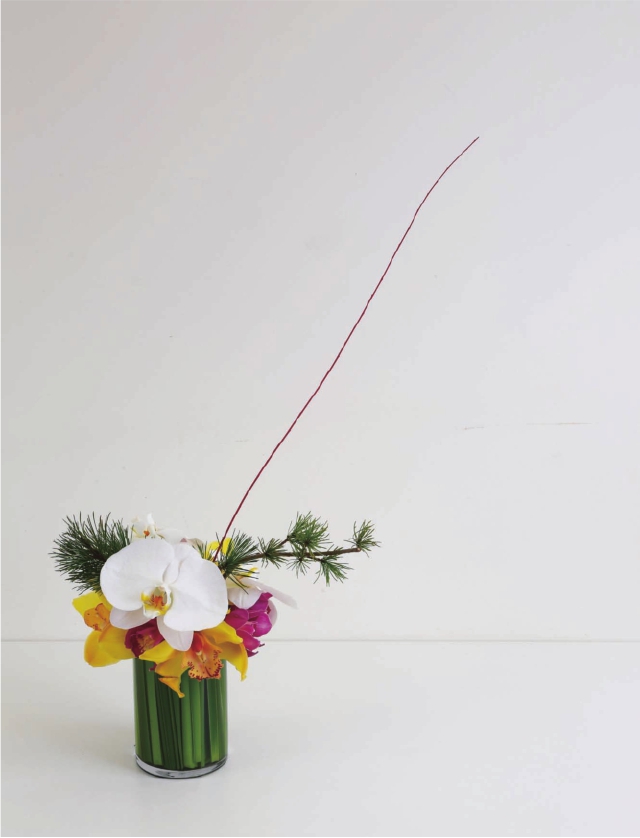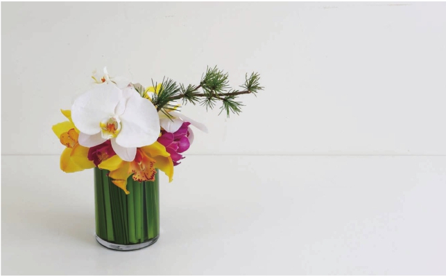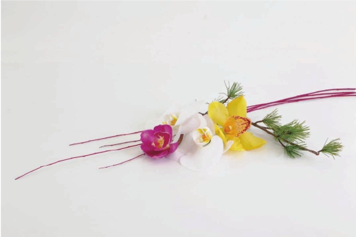 步骤六 在蝴蝶兰的空隙中插上一枝松枝,这一枝可以稍稍长一点,拉长作品的横向空间。