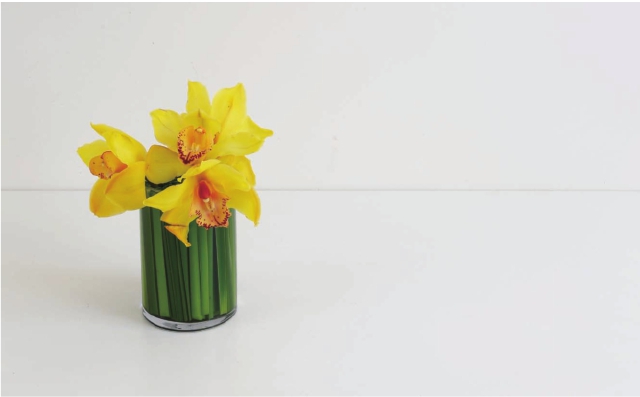 步骤二 将惠兰一朵朵从枝条上剪下来备用,先插上一朵黄色的惠兰(将花枝插在蒲棒叶的空隙中,你会发现很容易将它们固定下来)。